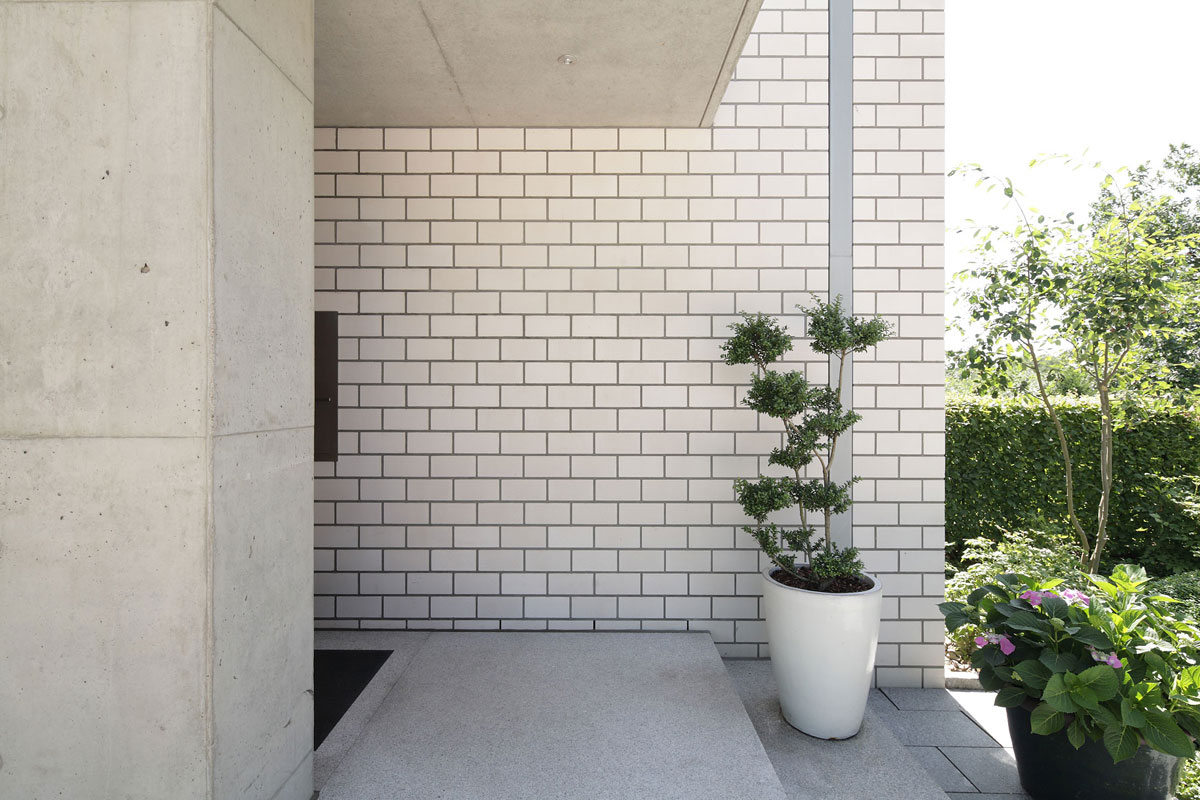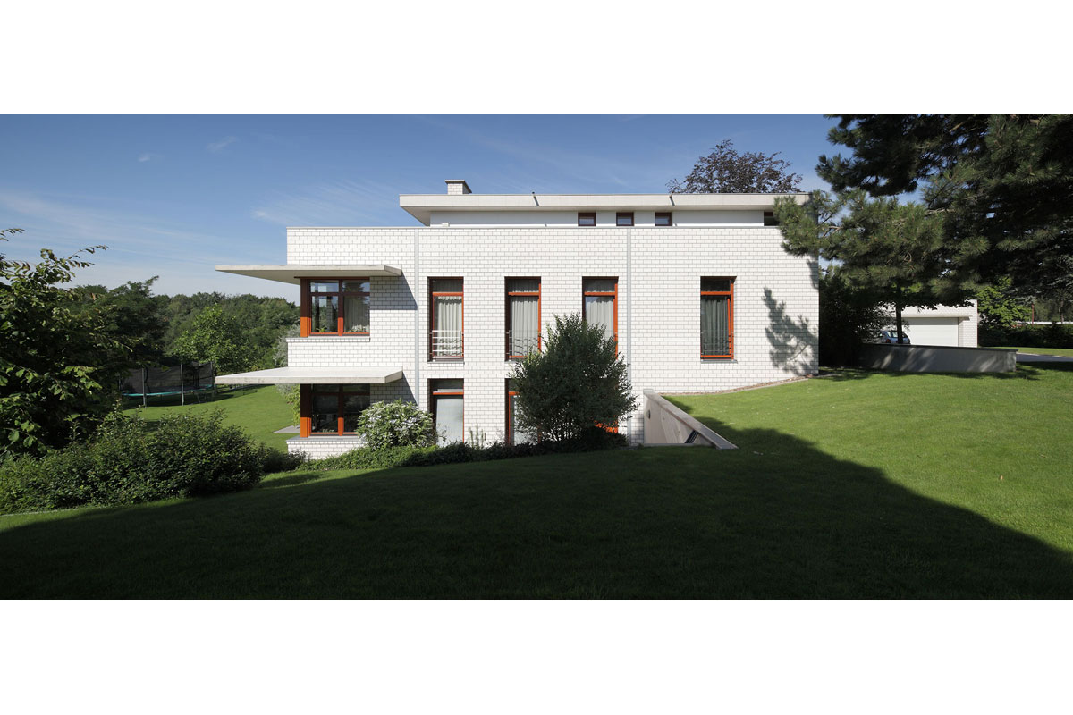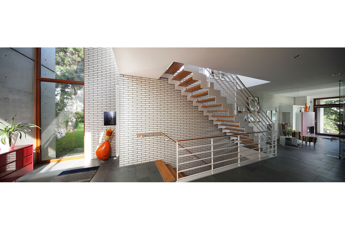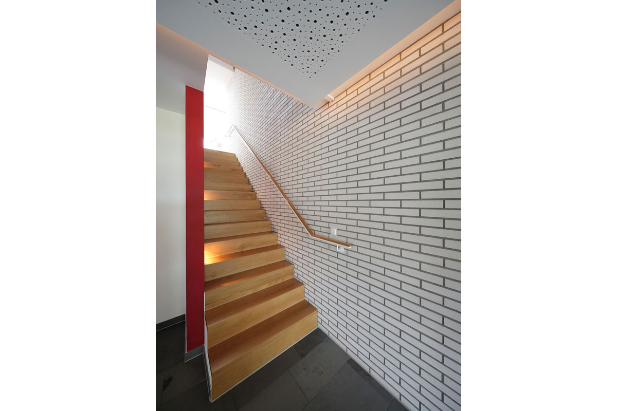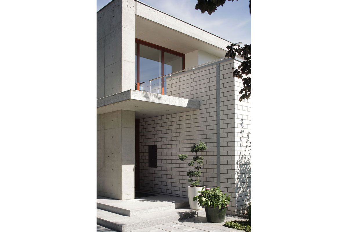 Durch diese Verbindung entsteht ein Spannungsverhältnis, welches das Erscheinungsbild des Kalksandsteins als „Weißen Stein“ besonders hervorhebt. Dies wird weiter unterstützt durch die einfache geometrische Form des Baukörpers und das konsequente Einhalten der Baurichtmaße, es wurde kein Stein geschnitten.