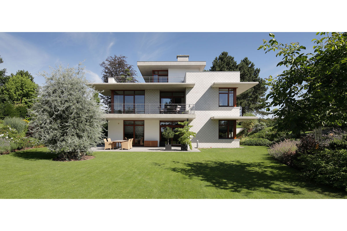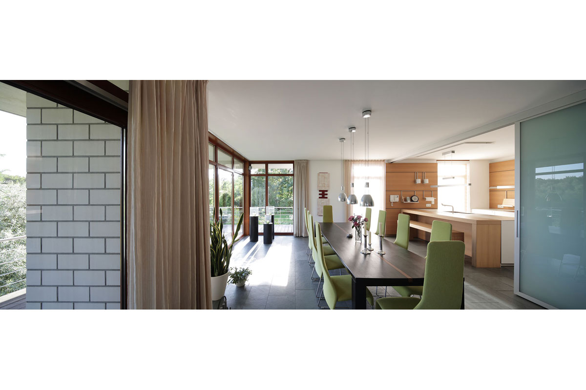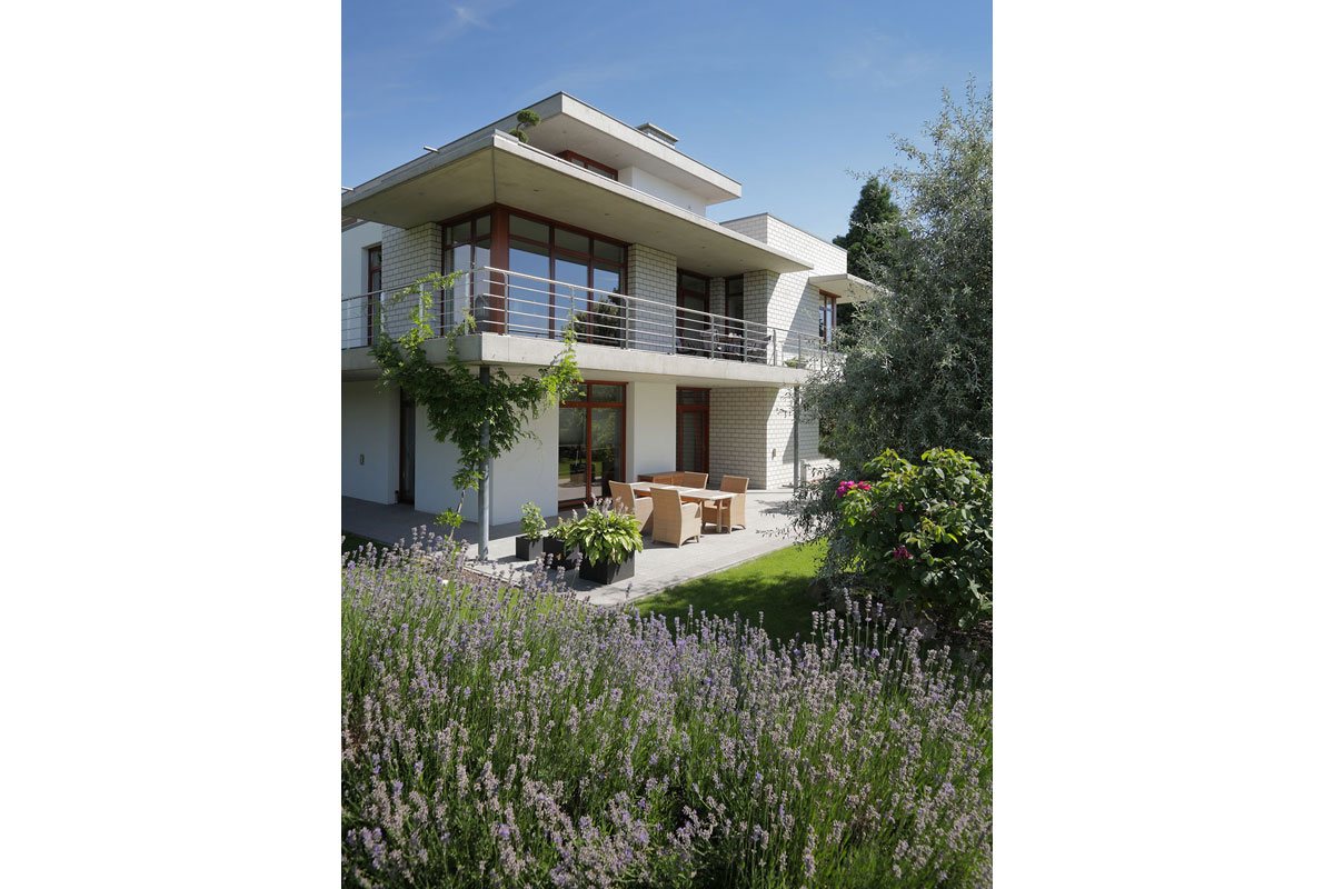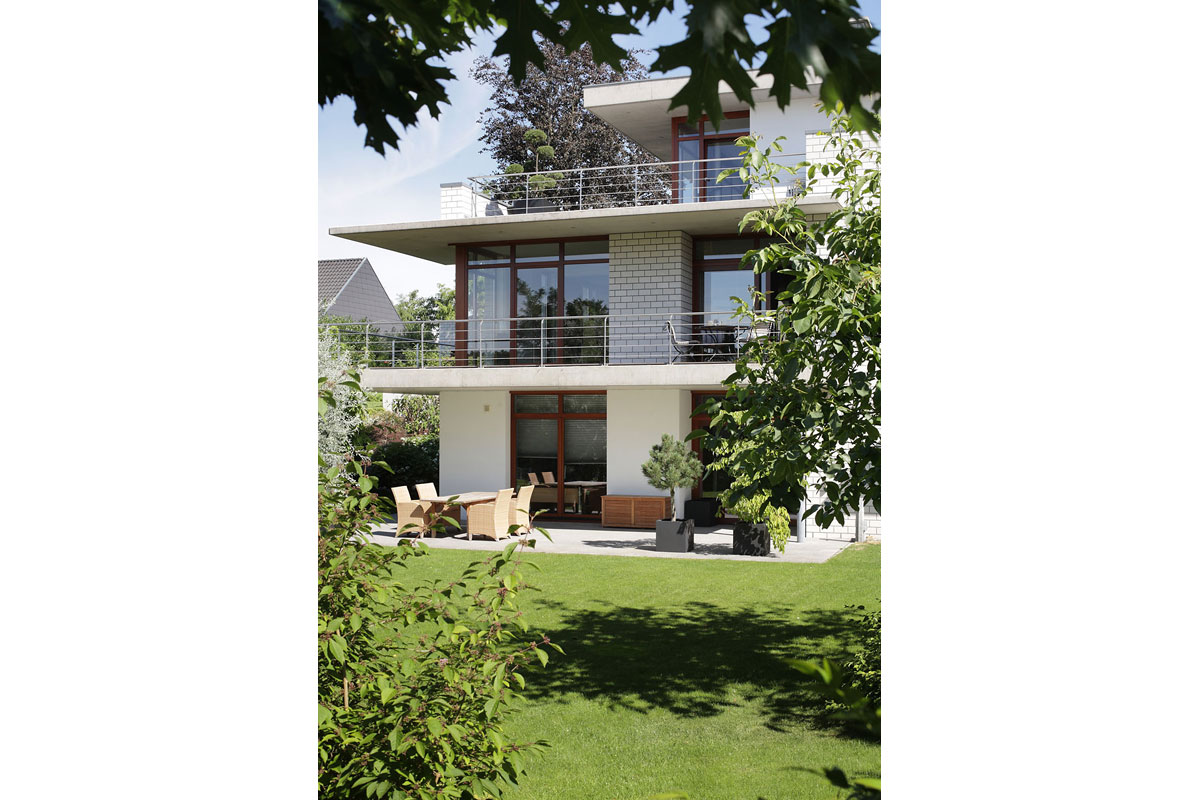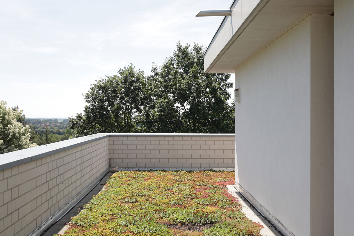 Die klare Anordnung der Räume sorgt für leichte Orientierung und eine wahrnehmbare Grundrissstruktur. Durch vorspringende Bauteile wird ein passiver Sonnenschutz gewährleistet. Die Sonne wird im Sommer vollständig aus dem Haus herausgehalten und im Winter erwärmt sie die Wohnräume. Begrünte Dachflächen, eine kontrollierte Be- und Entlüftung und eine in Kürze zu installierende Photovoltaikanlage lassen eine gute Ökobilanz erwarten.