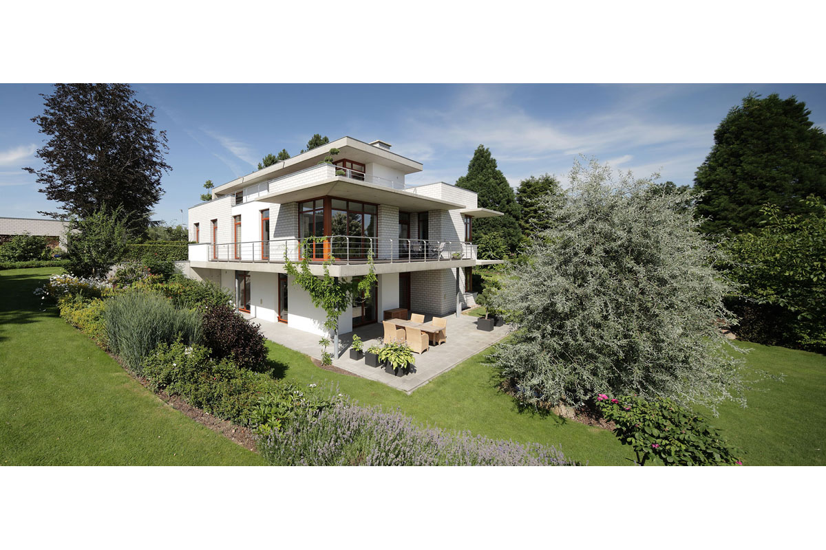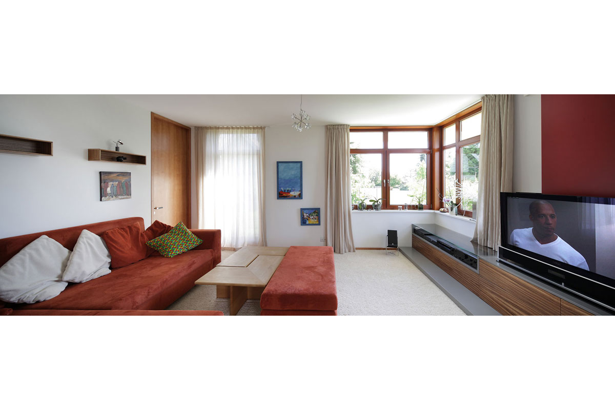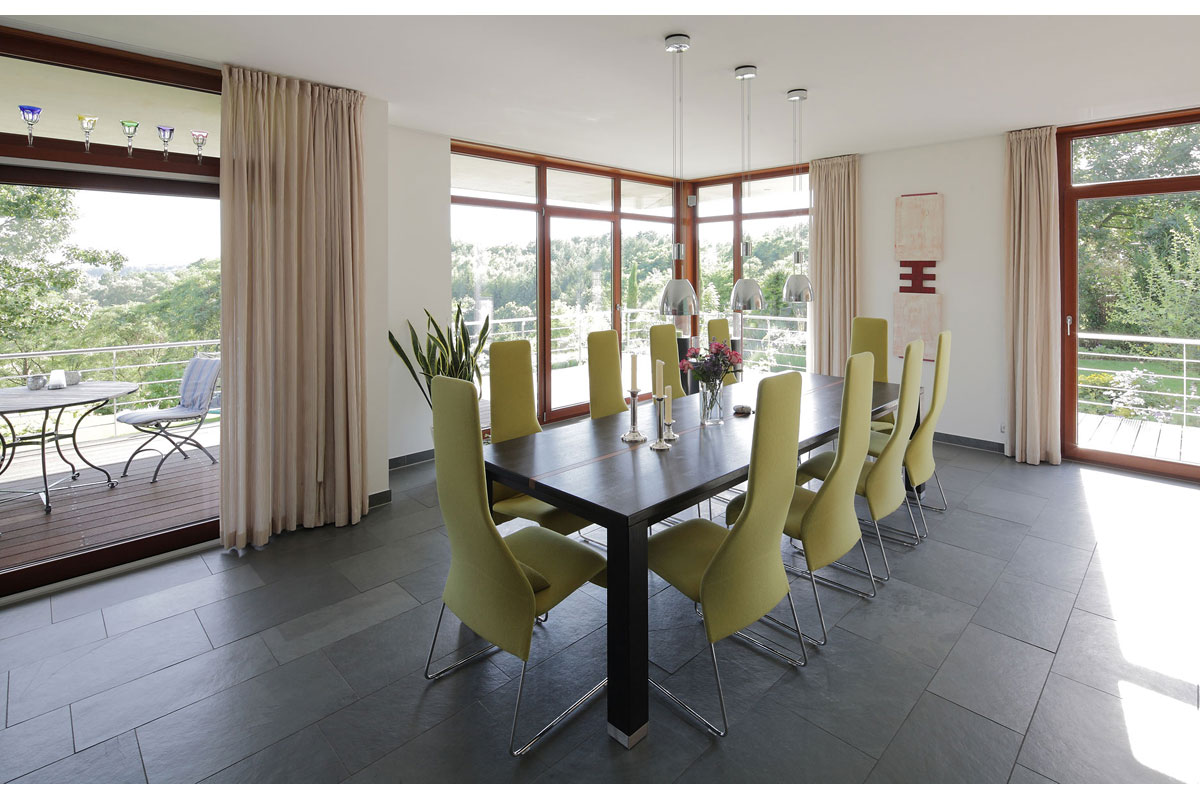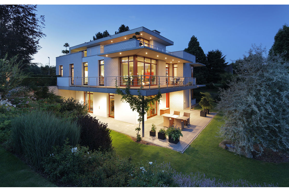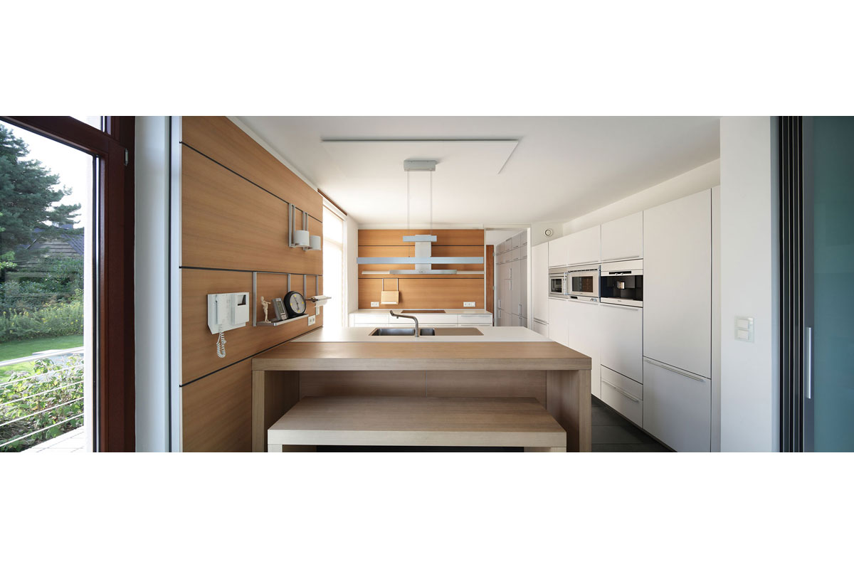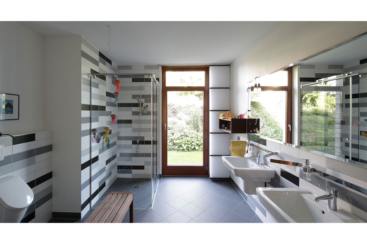 Die klare Anordnung der Räume sorgt für leichte Orientierung und eine wahrnehmbare Grundrissstruktur. Durch vorspringende Bauteile wird ein passiver Sonnenschutz gewährleistet. Die Sonne wird im Sommer vollständig aus dem Haus herausgehalten und im Winter erwärmt sie die Wohnräume. Begrünte Dachflächen, eine kontrollierte Be- und Entlüftung und eine in Kürze zu installierende Photovoltaikanlage lassen eine gute Ökobilanz erwarten.