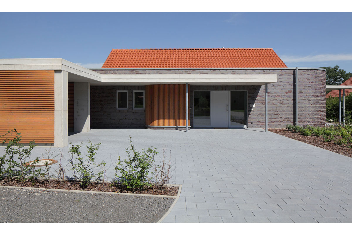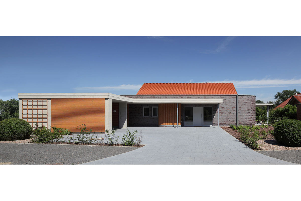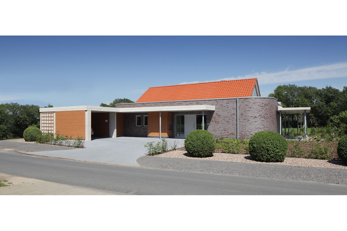 Trotz strenger Gestaltungssatzung in einem Neubaugebiet wirkt das Haus originell. Es geht gestalterisch einen eigenen Weg und doch werden alle Funktionen berücksichtigt, die ein alten- und behindertengerechtes Haus haben sollte.