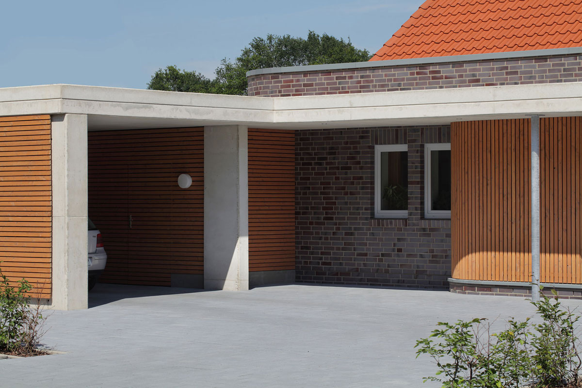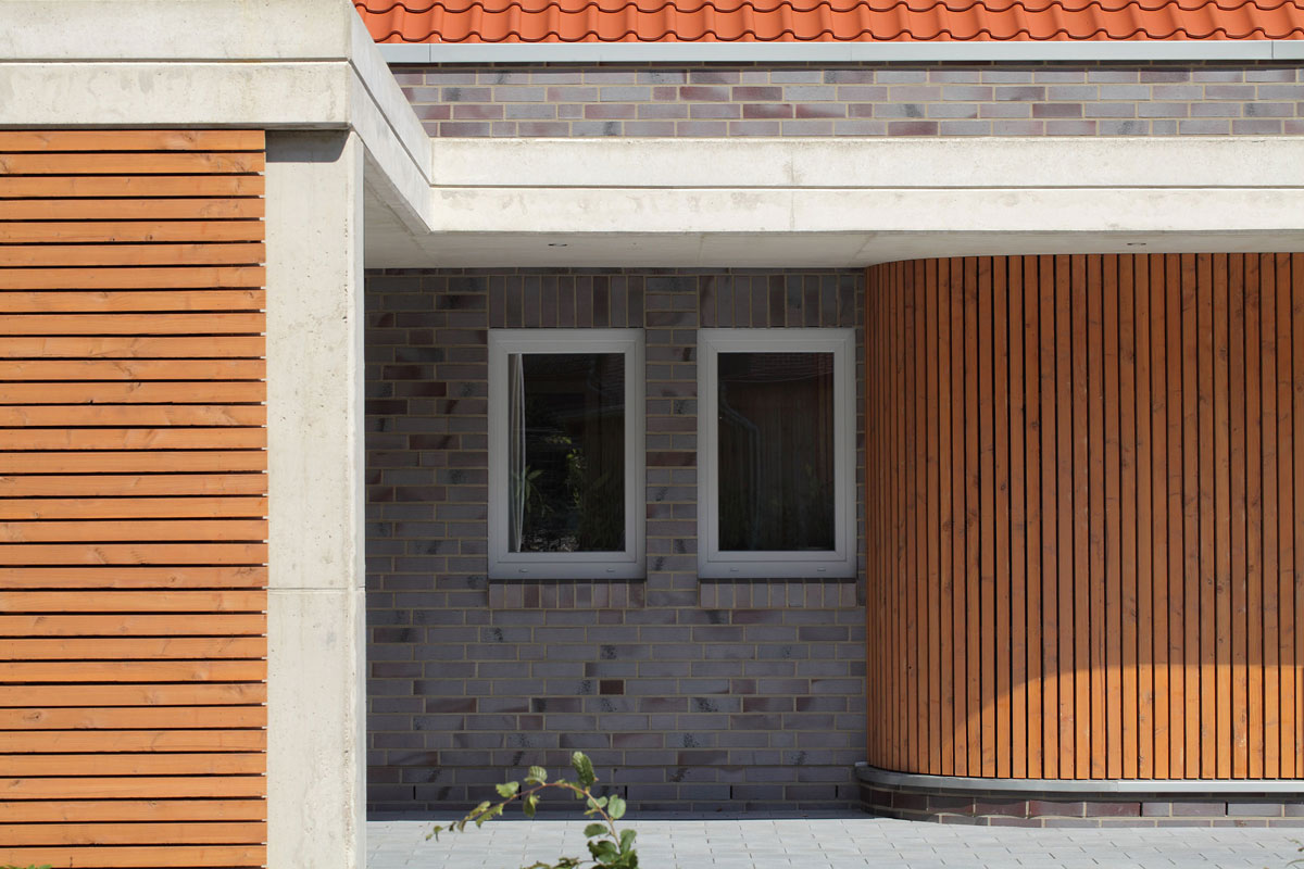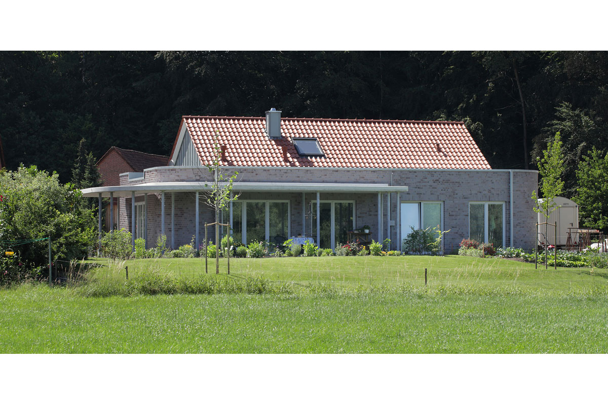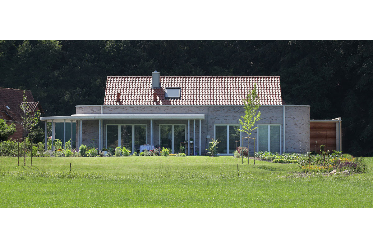 Trotz strenger Gestaltungssatzung in einem Neubaugebiet wirkt das Haus originell. Es geht gestalterisch einen eigenen Weg und doch werden alle Funktionen berücksichtigt, die ein alten- und behindertengerechtes Haus haben sollte.