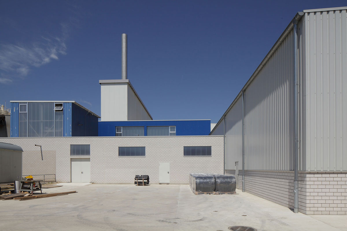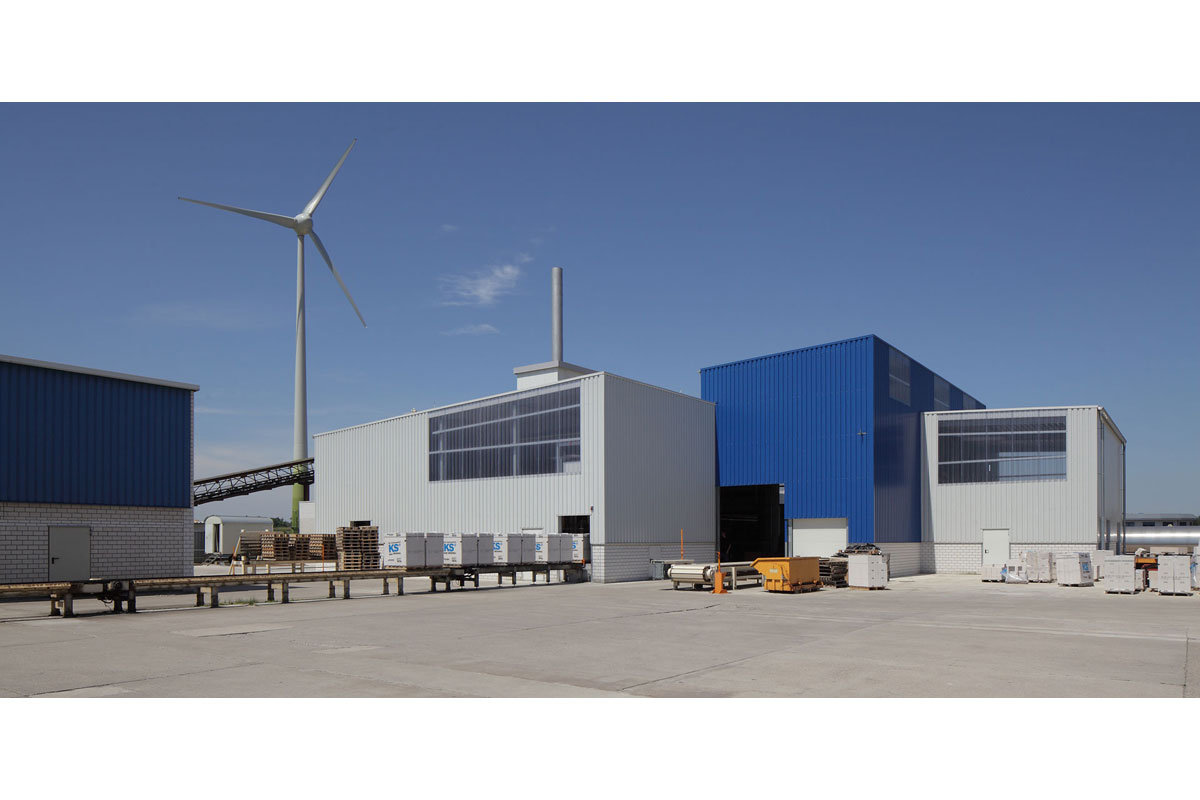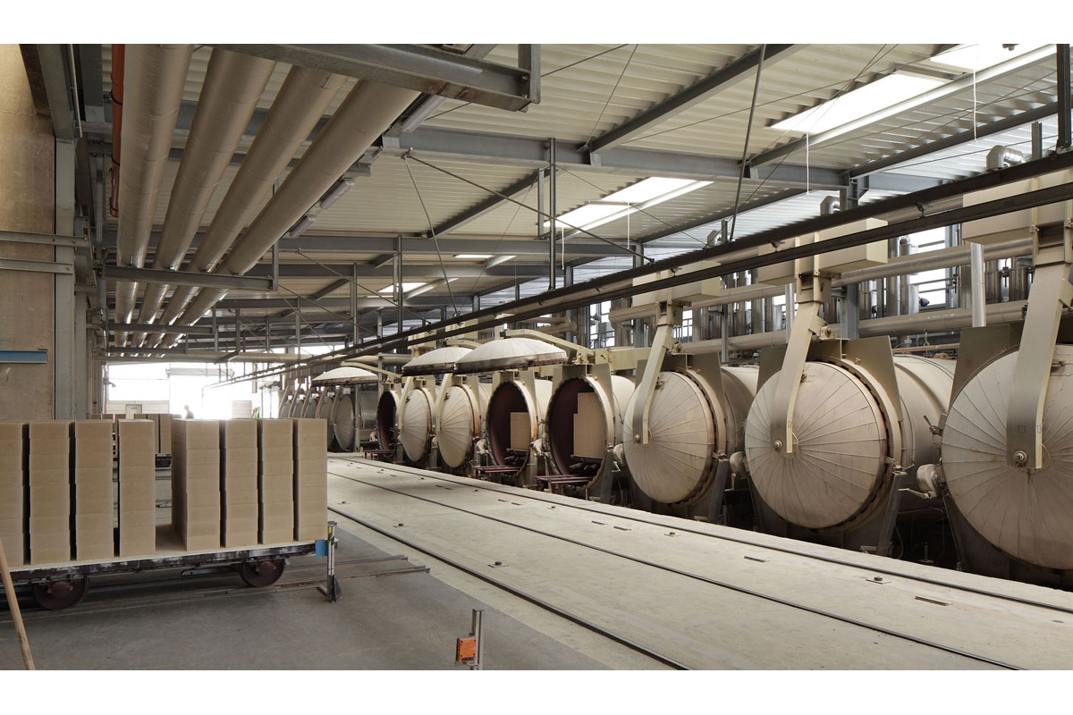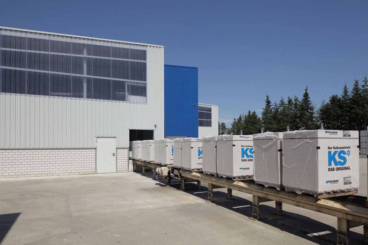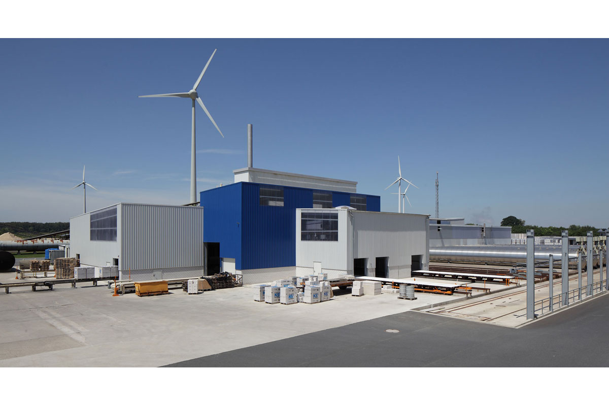 Erweiterungsbau im laufenden Betrieb für Autoklaven, die zur Herstellung von Kalksandsteinen dienen. Mischbauweise aus Stahl, Sandwichwand- und dachpaneelen sowie Kalksandstein.