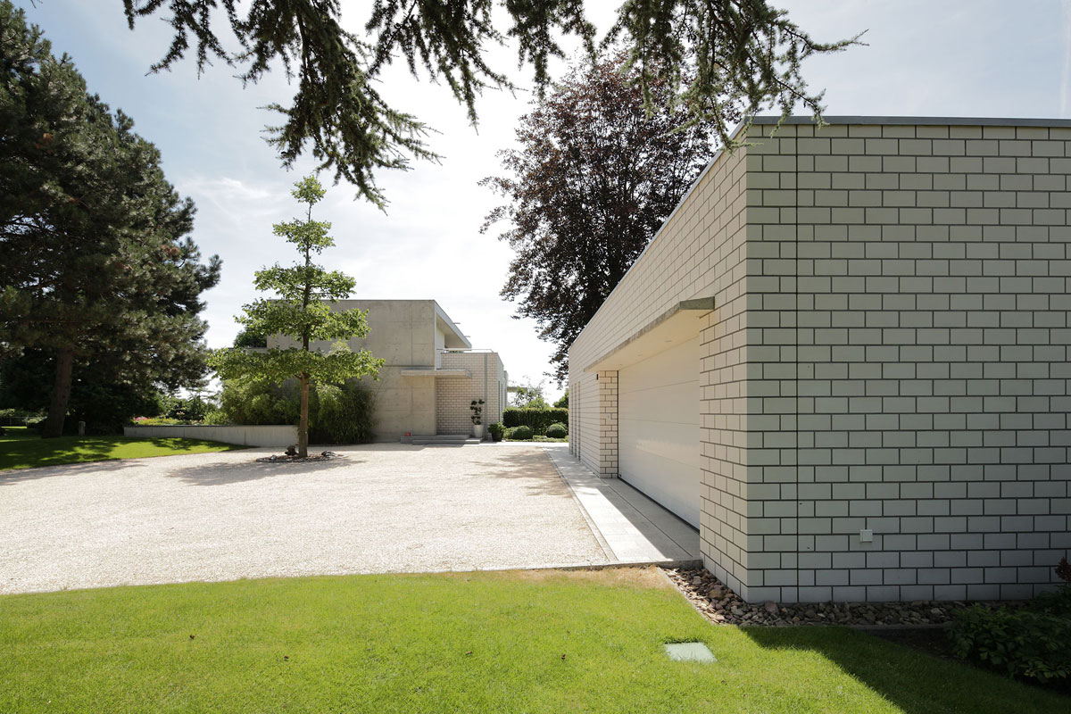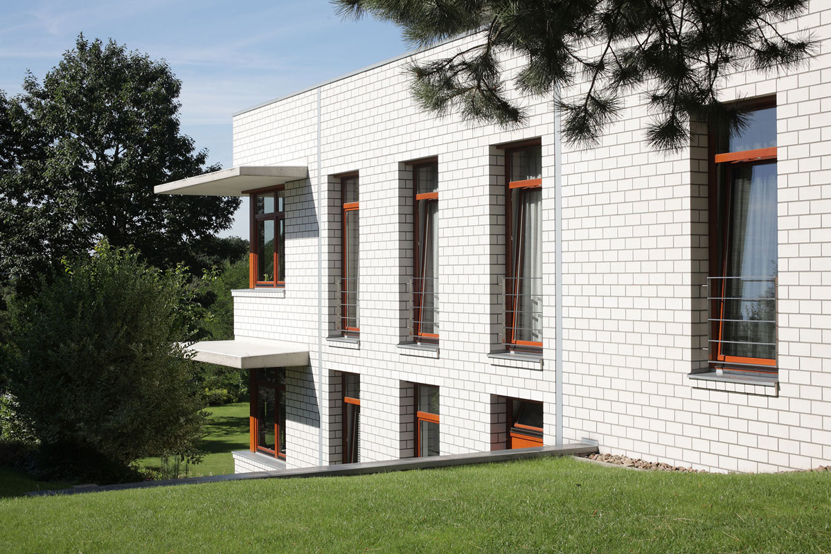 Durch diese Verbindung entsteht ein Spannungsverhältnis, welches das Erscheinungsbild des Kalksandsteins als „Weißen Stein“ besonders hervorhebt. Dies wird weiter unterstützt durch die einfache geometrische Form des Baukörpers und das konsequente Einhalten der Baurichtmaße, es wurde kein Stein geschnitten.